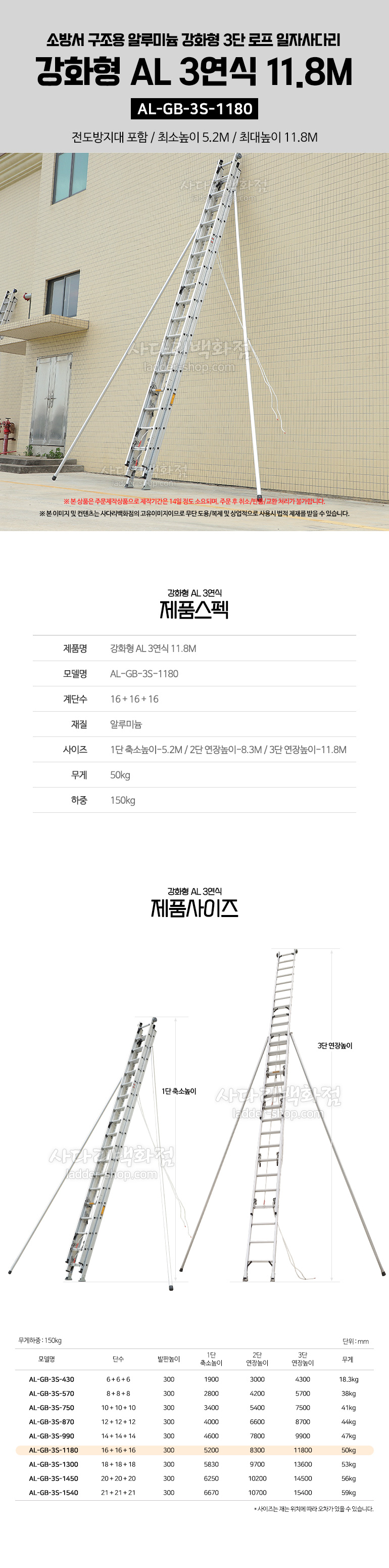 AL-GB-3S-1180 소방서 구조용 AL 강화형 3단 로프형 사다리 11.8M