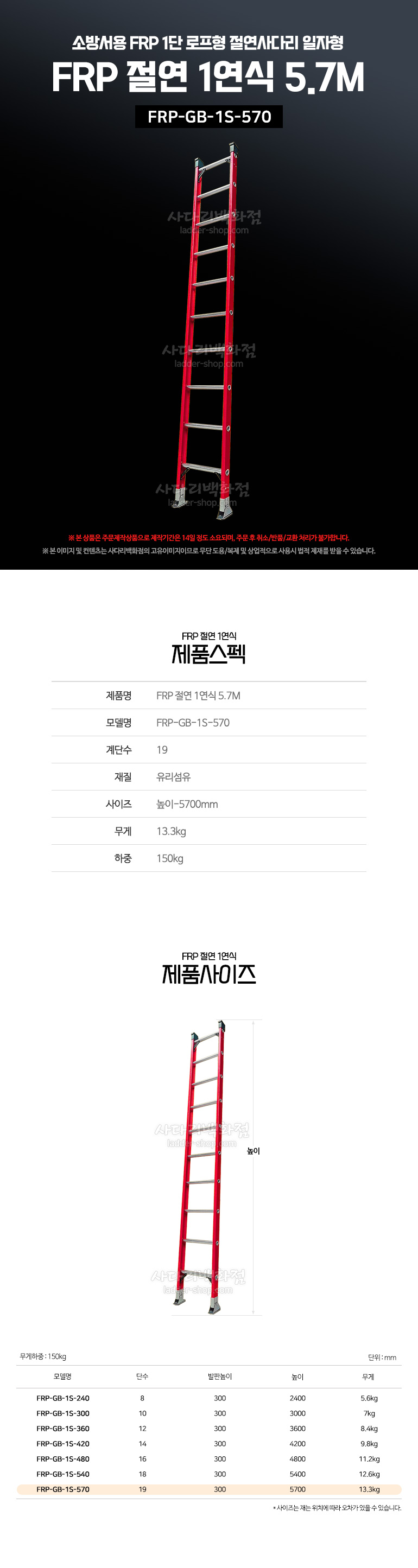 FRP-GB-1S-570 소방서 구조용 FRP 1단 일자형 절연사다리 5.7M