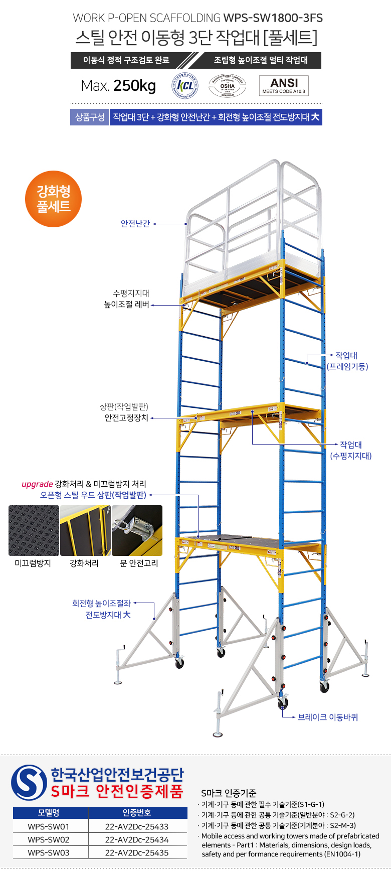 [S인증] WPS-SW-03 스틸 안전 이동형 3단 작업대 [1800-3FS 강화형 풀세트]