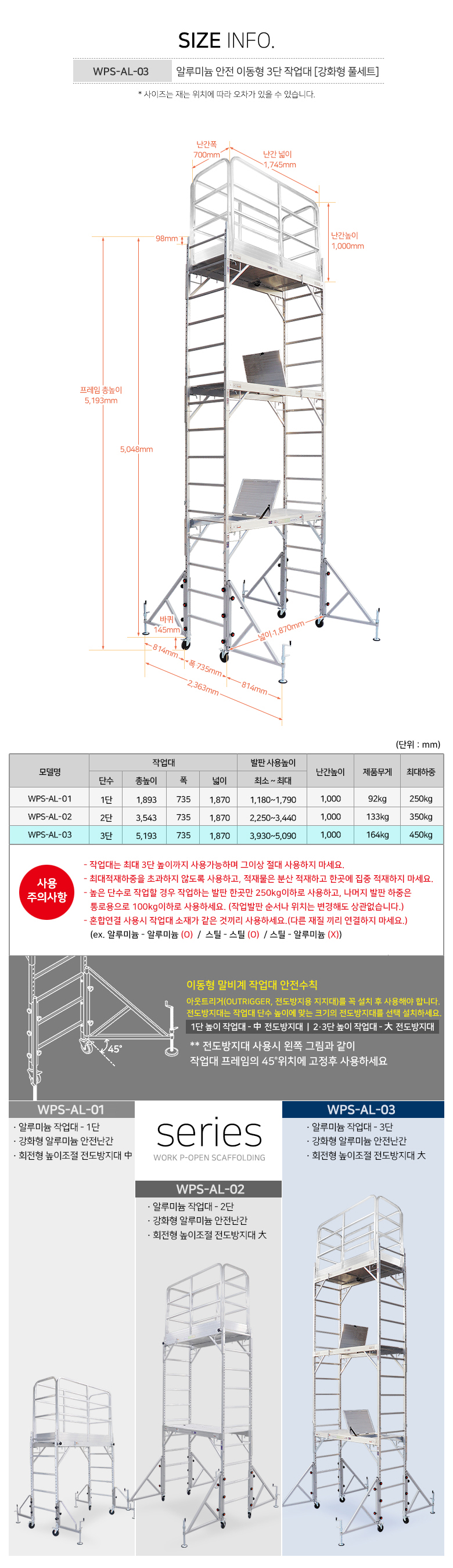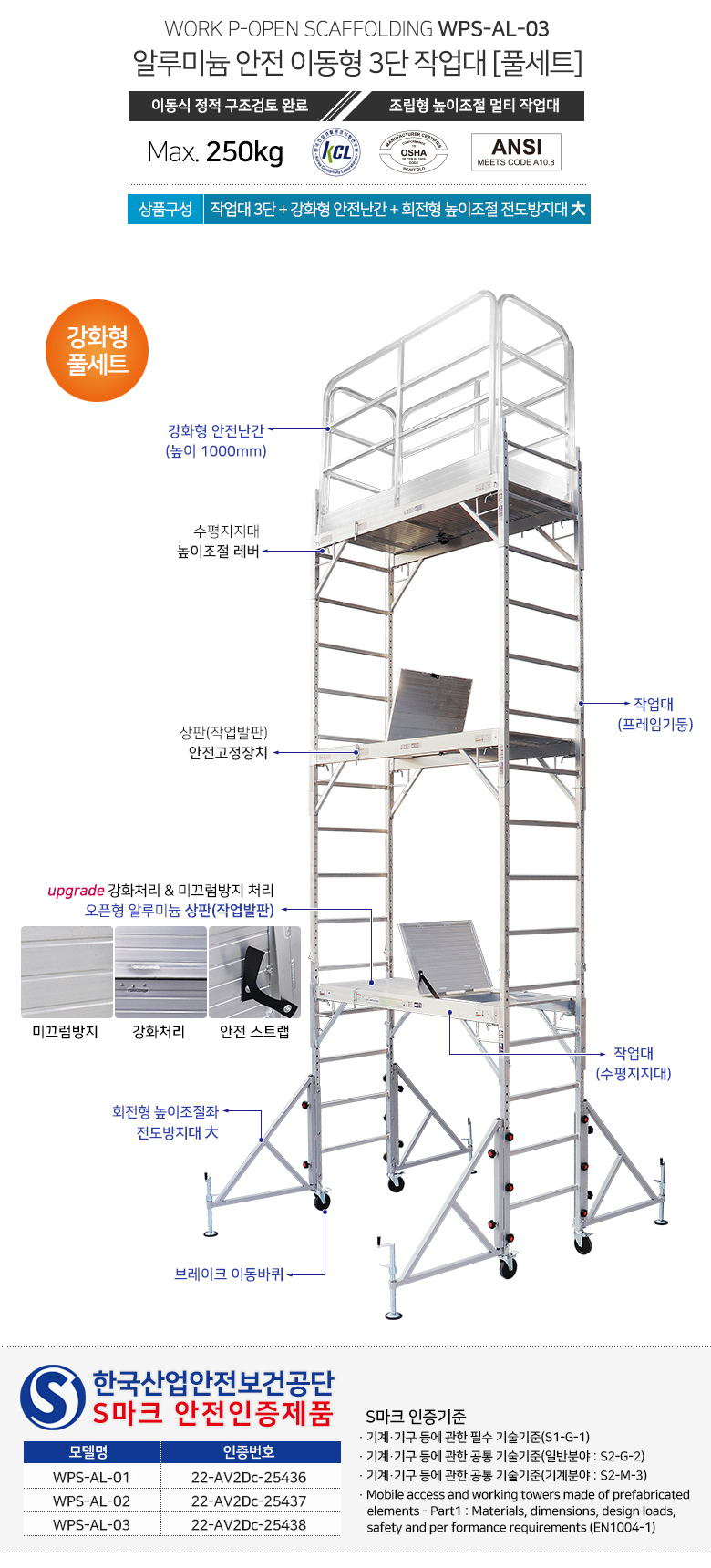 [S인증] WPS-AL-03 알루미늄 안전 이동형 3단작업대 [1800-3FS 강화형 풀세트]